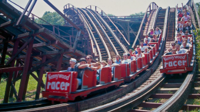 The Racer at Kennywood is the park’s first and only racing coaster, with two cars side by side, letting cars race each other. This coaster has a height of 72 and a half feet, with a drop a little under 45 feet at a 50-degree angle. The maximum speed of this wooden coaster is 40 miles per hour, with a track length of approximately 2,250 feet and a ride duration of about a minute and thirty seconds. This coaster opened in 1927 and was built and designed by John A. Miller and Charlie Mach.